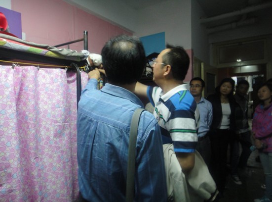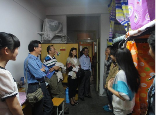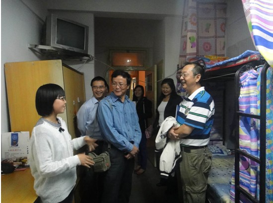 2013年9月4日19:30,曹进院长、李杰副书记、凌茜副院长、高育松副院长、王建人副院长和2013级全体班主任老师在学院团委辅导员与学生会成员的陪同下,赴兰天公寓2号和11号宿舍楼看望了2013级全体本科生。