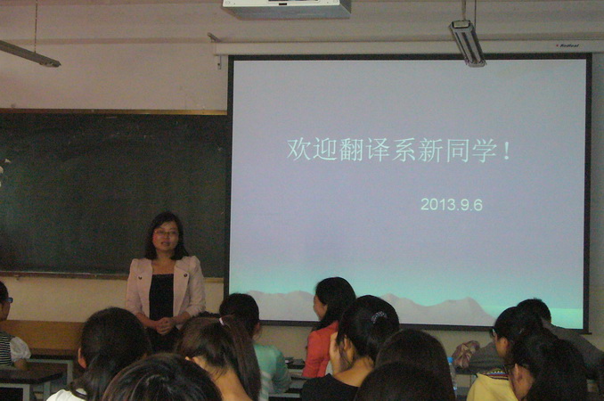 2013年9月6日下午3:00,翻译系2013级本科生迎新专题讲座在教学3号楼605教室举行。翻译系系主任董晓华老师、副主任杨晓红老师、2013级翻译2班班主任保菁菁老师、以及2013级全体翻译专业学生参加了此次讲座。此次讲座由董晓华老师主持。