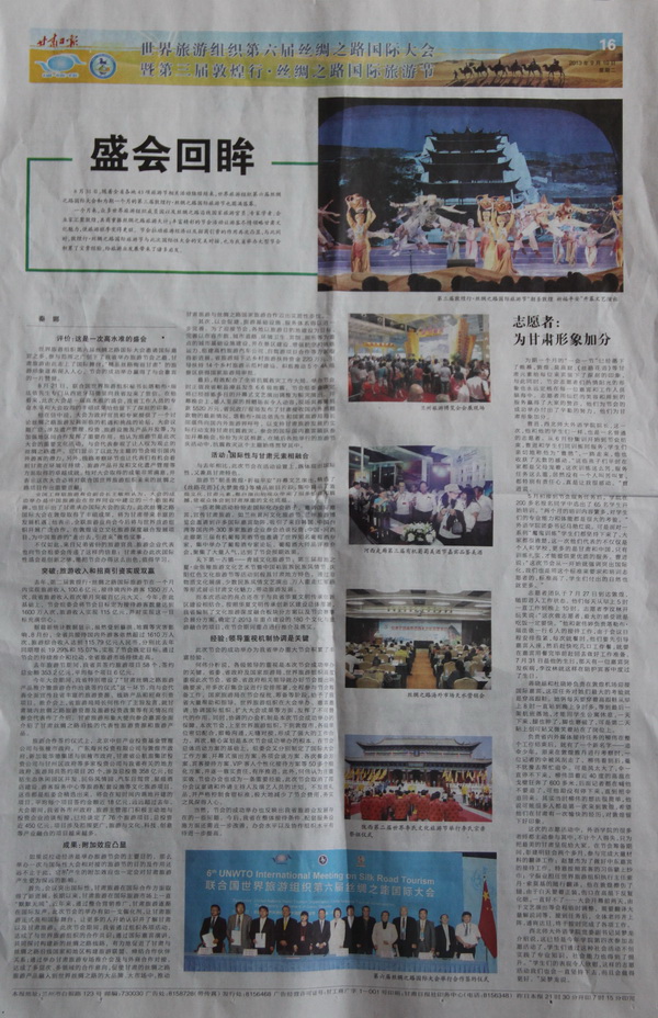 7月28日至8月6日,威廉希尔官网58名师生在曹进院长带领下,参与了世界旅游组织第六届丝绸之路国际大会暨第三届敦煌行·丝绸之路国际旅游节的志愿服务活动。志愿者们以饱满的热情和精心细致的服务赢得了海内外嘉宾的一致赞许和高度评价。2013年9月10日的甘肃日报16版全文报道了此次志愿服务活动。