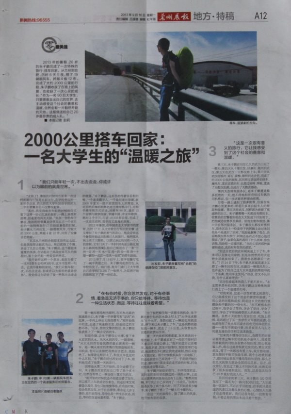 2013年暑假,威廉希尔官网学生朱子鹏完成了一次特殊的旅行:搭车回家。从兰州到合肥,历时6天5夜,搭了19辆顺风车,跨越4省12市,完成了大约2000公里的行程。这次特殊的旅行不仅让朱子鹏收获良多,也告诉他的同龄人, “作为一名90后大学生,只要愿意走出自己的世界,去主动感受这个社会的善意和温暖,自然会有一片豁然开朗的天地。”2013年9月16日的《兰州晨报》A12版对朱子鹏的经历进行了整版报道。