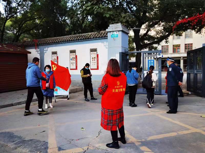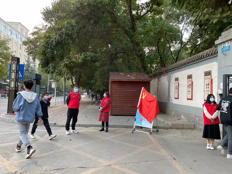 10月27日,学院党委组织20余名师生党员志愿者以“学生在哪,我们在哪”为主题开展了一次别有意义的主题党日活动。大家深入学校南门至党校公寓段,设立党员先锋岗,开展学生疏导引导服务,协助做好往返学校用餐,为学生们有序、安全学习和生活提供保障。哪里有任务,哪里就有党员志愿者和先锋岗。在疫情防控战中,西门口、天桥上、公寓门、餐厅里、寝室中以及三个核算采样点,到处都有学院党员志愿者的身影。党旗就是命令、就是责任、就是担当!广大师生党员志愿者用觉悟和守护,有力彰显了基层党组织的战斗堡垒作用和党员的先锋模范作用。