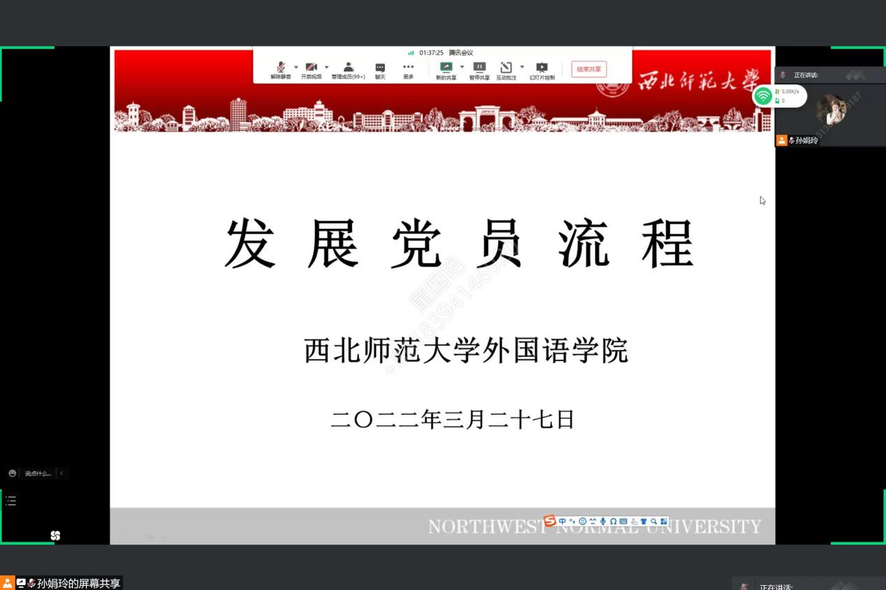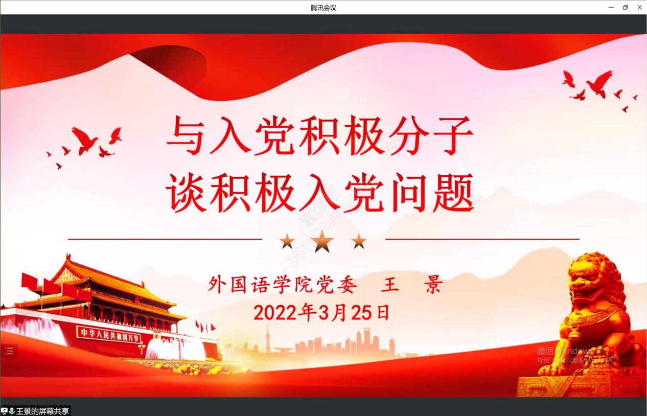 学院党委书记王景参加培训班开班式,并作了题为《与入党积极分子谈积极入党问题》首场报告。王景同志采用2W1H结构法,围绕争取早日加入中国共产党、做一名合格的共产党员,给全体学员上了一堂生动的党课。王景要求全体学员遵守培训纪律,严格自身要求,全身心投入学习培训,不断加深对党的性质宗旨的认识和对党的基本知识的掌握,以实际行动积极向党组织靠拢。学院党委委员、英语系主任王国礼老师作了《坚持制度自信 迈向民族复兴——从中西方疫情防控看中国制度优势》辅导报告,通过分析中西方疫情防控典型事例,彰显了社会主义制度的优越性,揭示了全国上下用抗疫行动诠释人类命运共同体的真谛。教工第一党支部书记吕文澎老师作了《如何用外语讲好中国故事》辅导报告,吕老师结合外语专业学习强调坚持文化自信的重要性,鼓励大家用外语讲好中国故事,承担好作为外国语专业学生的责任和使命。学院党委组织员孙娟玲作了《发展党员流程》辅导报告,进一步引导入党积极分子明确了入党目的,熟悉了党员发展程序。