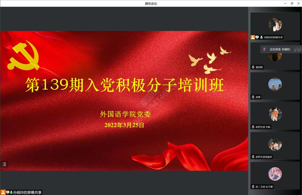 3月25日至29日,学院党委举办第139期入党积极分子培训班,采取专题辅导授课、观看纪录片、安排个人自学、进行结业考试等,对各支部推荐的100名入党积极分子进行党性教育培训。