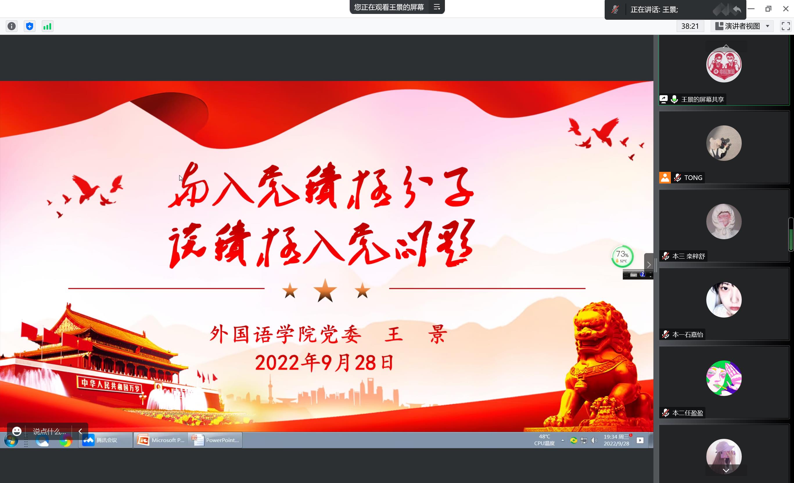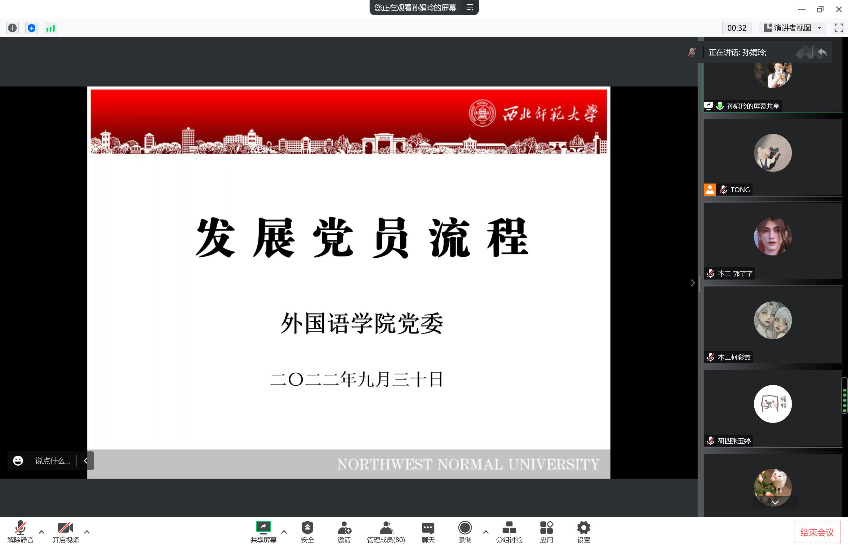 学院党委书记王景参加培训班开班式,并作了首场报告,围绕建党精神、入党初心和如何做一名合格的共产党员等,勉励入党积极分子弘扬伟大建党精神,永葆入党初心使命,以实际行动积极向党组织靠拢。研究生第二党支部书记马艳红老师、往届毕业生党员李霖、万春红同学作了《党员的个人成长》辅导报告,马老师和两位往届毕业生党员通过分享自己的成长经历,讲述了如何从一名普通的大学生成长为一名共产党员的励志故事。研究生第三党支部书记、辅导员张碧全老师围绕端正入党动机、发挥党员先锋模范作用以及如何在“抗疫”大考下践行入党初心上了一堂生动的实践党课。最后,学院党委组织员孙娟玲作了《发展党员流程》辅导报告,帮助入党积极分子熟悉党员发展程序,引导党员明确先锋模范作用的具体要求。
