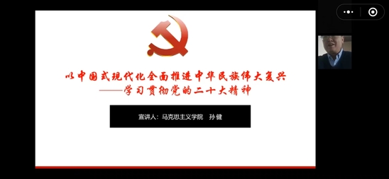 报告会上,孙健教授作了题为《以中国式现代化全面推进中华民族伟大复兴》的专题辅导报告。他从过去五年的工作和新时代十年的伟大变革、谱写马克思主义中国化时代化新篇章、新时代新征程中国共产党的使命任务、全面建设社会主义现代化国家的战略部署等方面,对党的二十大精神进行了全面系统解读。在深入辅导解读的基础上,就进一步学懂弄通党的二十大精神的核心要义提出思考建议,强调要牢记空谈误国、实干兴邦,坚定信心、同心同德,埋头苦干、奋勇前进,为全面建设社会主义现代化国家、全面推进中华民族伟大复兴而团结奋斗。