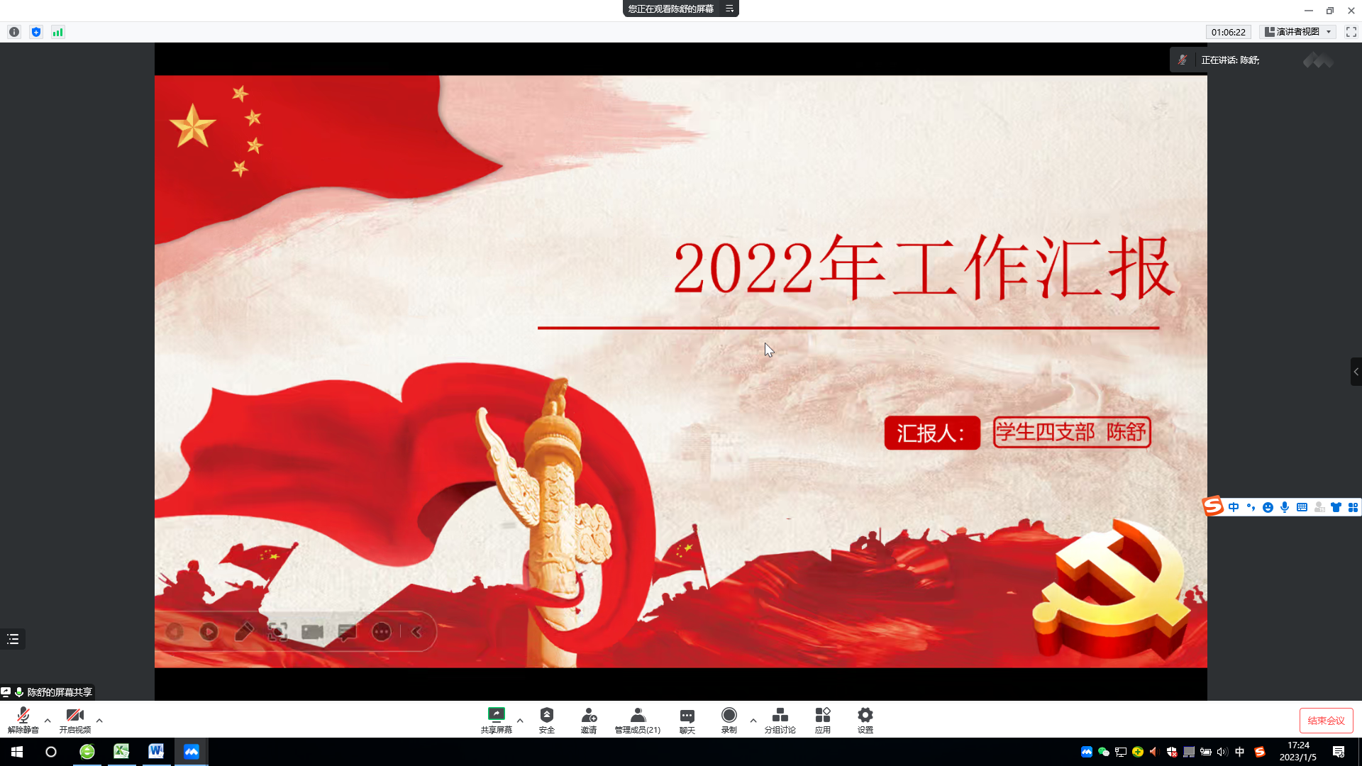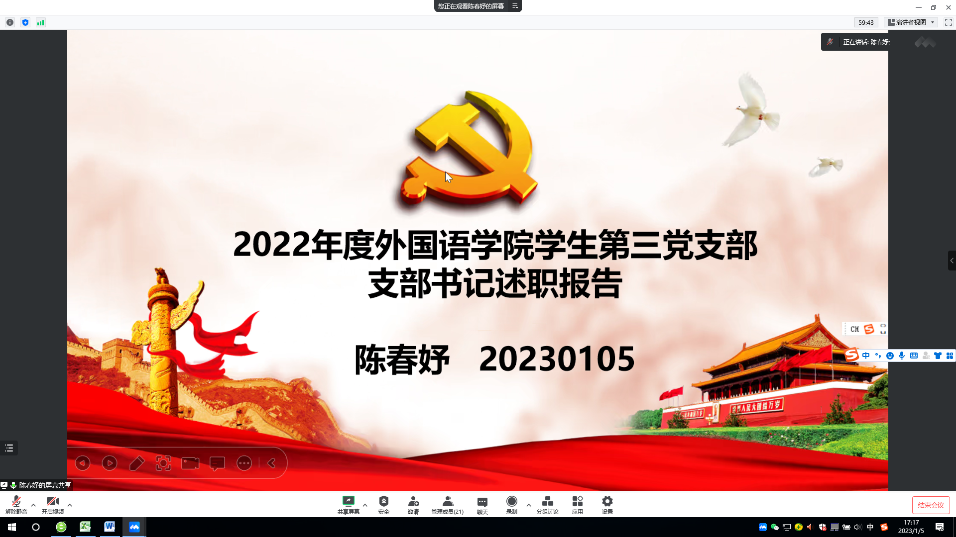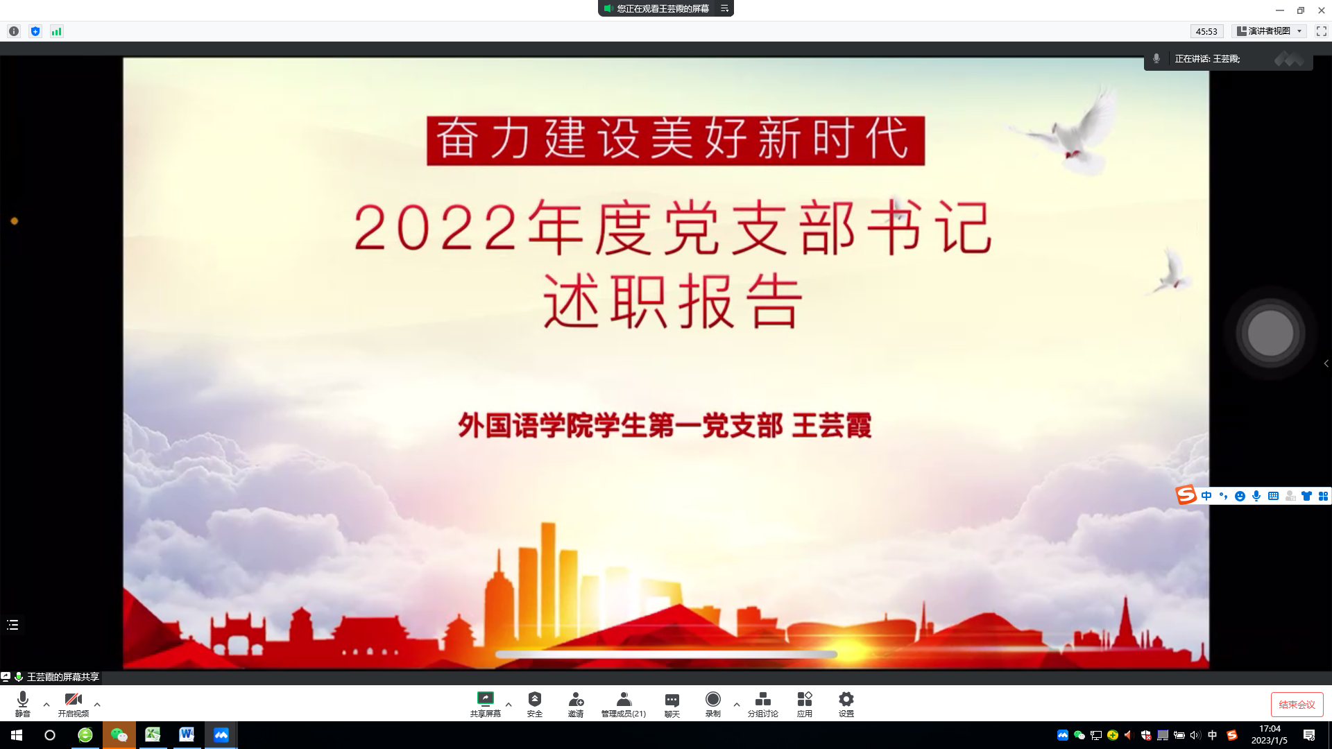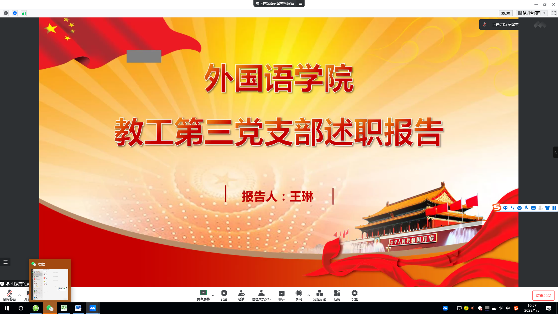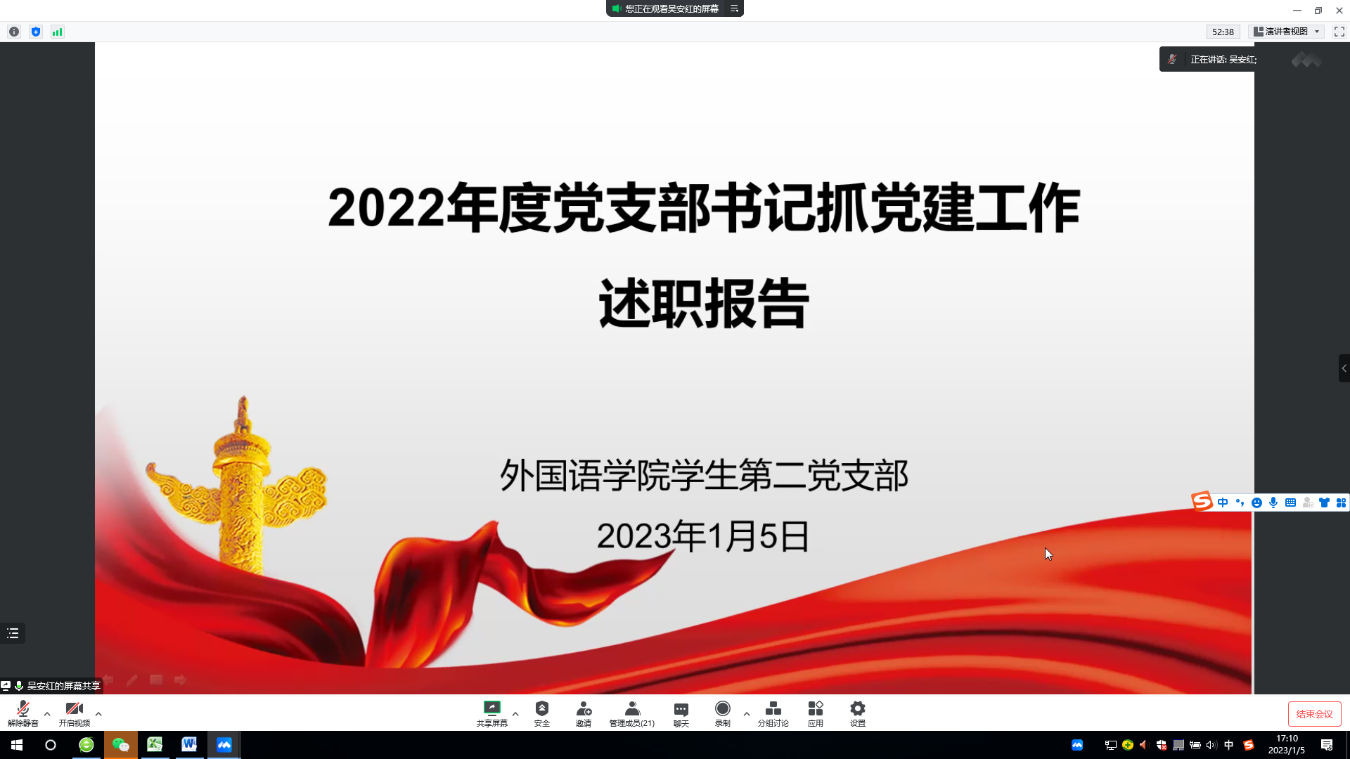 1月5日,学院党委线上召开2022年度党支部书记抓党建工作述职评议考核大会,总结考评支部党建工作。学院党委书记王景主持会议,院领导、党委委员、各党支部书记参加会议。