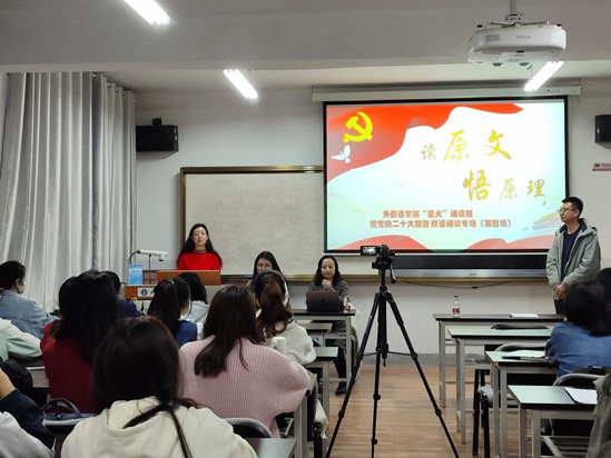 诵读活动在学院专职辅导员刘宁老师的主持下开始。首先领读人2019级英语专业本科生赵梓淇和2021级口译专业硕士研究生何瑾分别对党的二十大报告选段进行了双语诵读。梁海英老师从外语翻译专业的角度对党的二十大报告中的重点语法、特殊词句以及固定搭配进行了详细的分析和讲解。