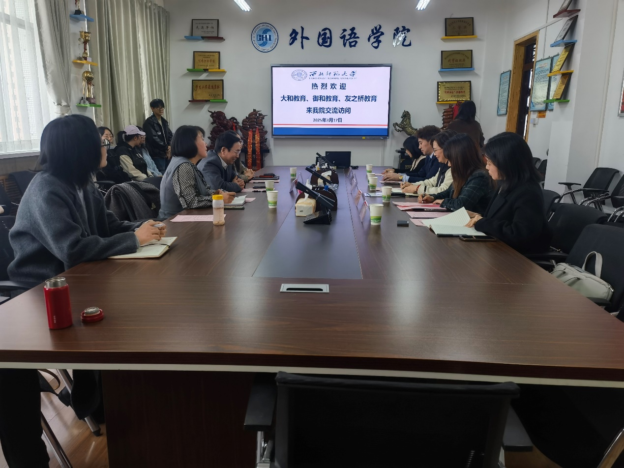 2025年3月17日,威廉希尔体育官方网站举行2025年度日语专业实习、升学及就业推进会,推进会分为座谈会和宣讲会两部分。学院邀请了日本大和语言教育学院、御和教育公司和重庆友之桥教育集团有限公司来校座谈,校国际合作交流处处长田河、副院长李莉、系主任曹正霞及日语系师生参会。