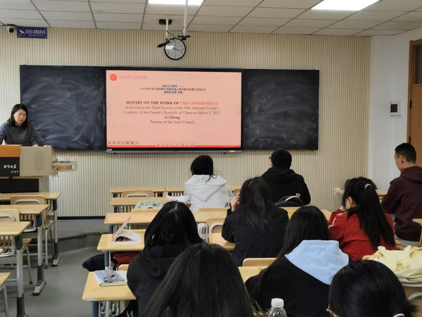 活动持续以2025年政府工作报告为主要内容展开,魏老师重点对报告中关于“2025年经济社会发展总体要求和政策取向”章节进行了双语诵读。同时,结合专业知识,对章节中的重点语法结构、专业术语翻译及固定搭配进行了深入解析,并组织同学们开展互动讨论。