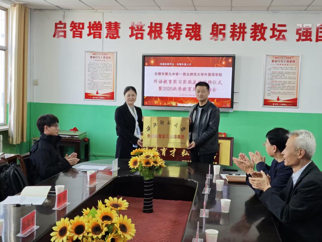 为深化高校与基础教育协同育人,强化外语专业学生实践能力培养,推动区域外语教育质量提升,2025 年10 月17 日下午,威廉希尔体育官方网站与白银市平川区白银市第九中学、白银市平川中学分别举行 “外语教育实习实践基地” 挂牌仪式,威廉希尔体育官方网站副院长陈倩、英语系副主任孙歆宇,白银九中党总支书记李奋山、校长胡得宝等领导,平川中学党总支书记吴琳、校长黄文东等领导,两所中学的教师代表,以及威廉希尔体育官方网站2023 级英语系见习学生共同参与此次活动,见证校地合作新起点。