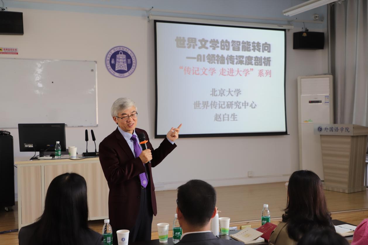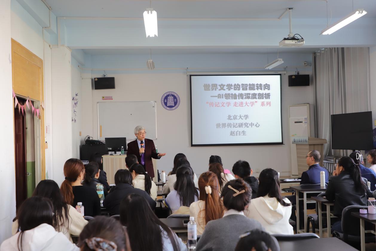 10月15日下午,北京大学威廉希尔体育官方网站教授、博士生导师赵白生应邀在致朴楼806教室,为我校师生带来了一场题为“世界文学的智能转向:AI领袖传记深度剖析”的精彩讲座。本次讲座由学院副院长俞婷教授主持,学院党委书记、相关专业教师与研究生、心理学院部分教师以及兰州交通大学部分教师等共计150余人参与。