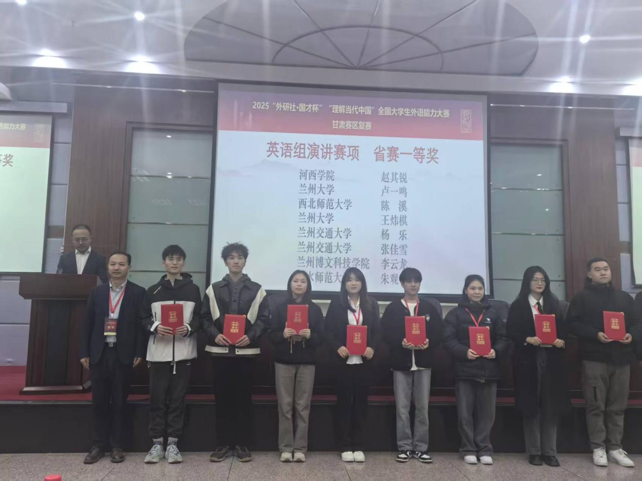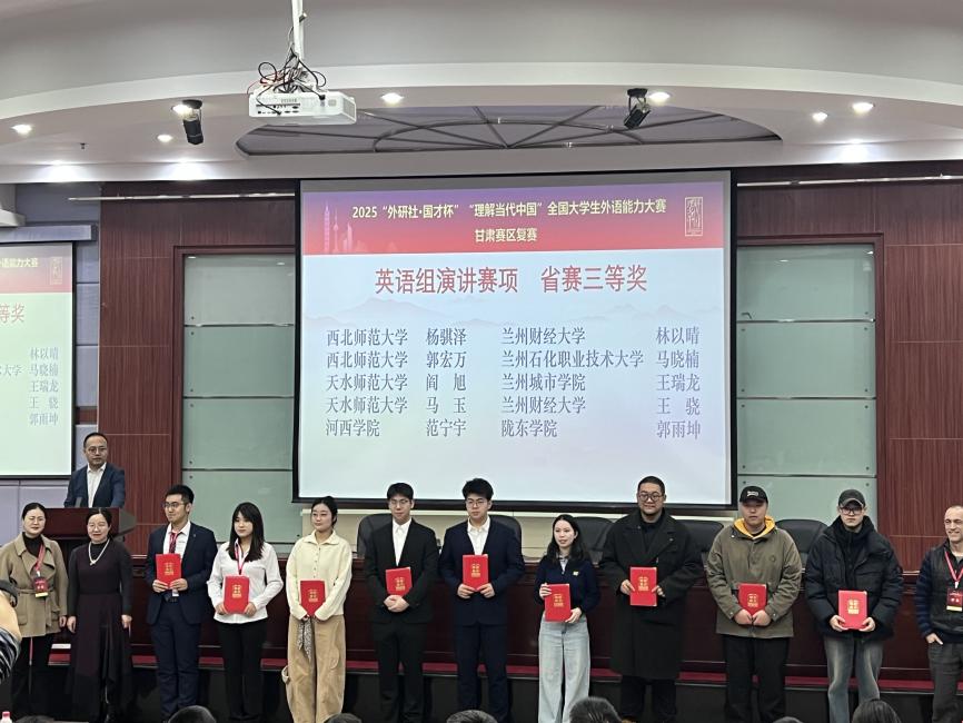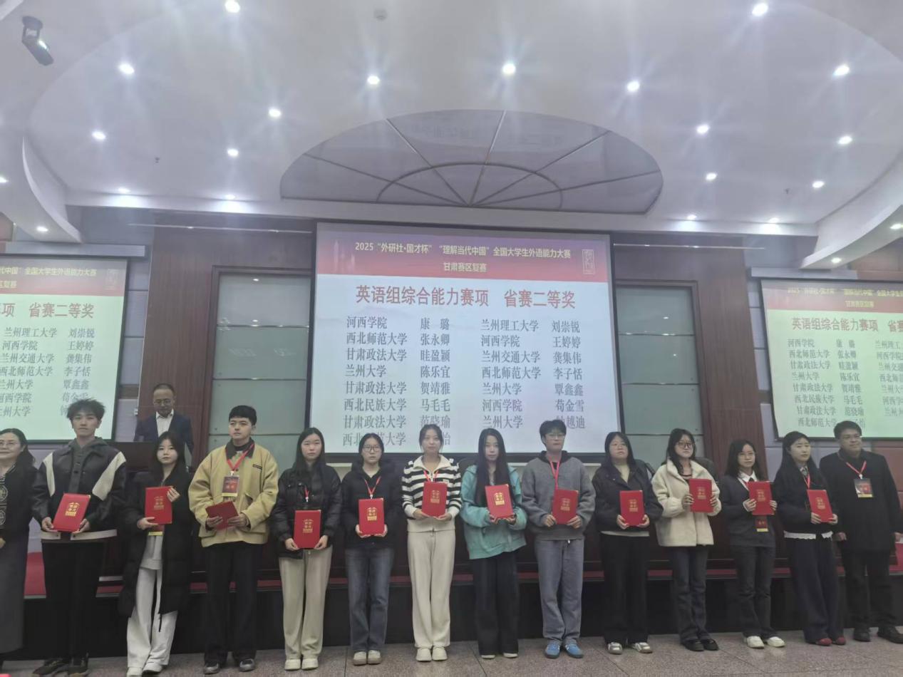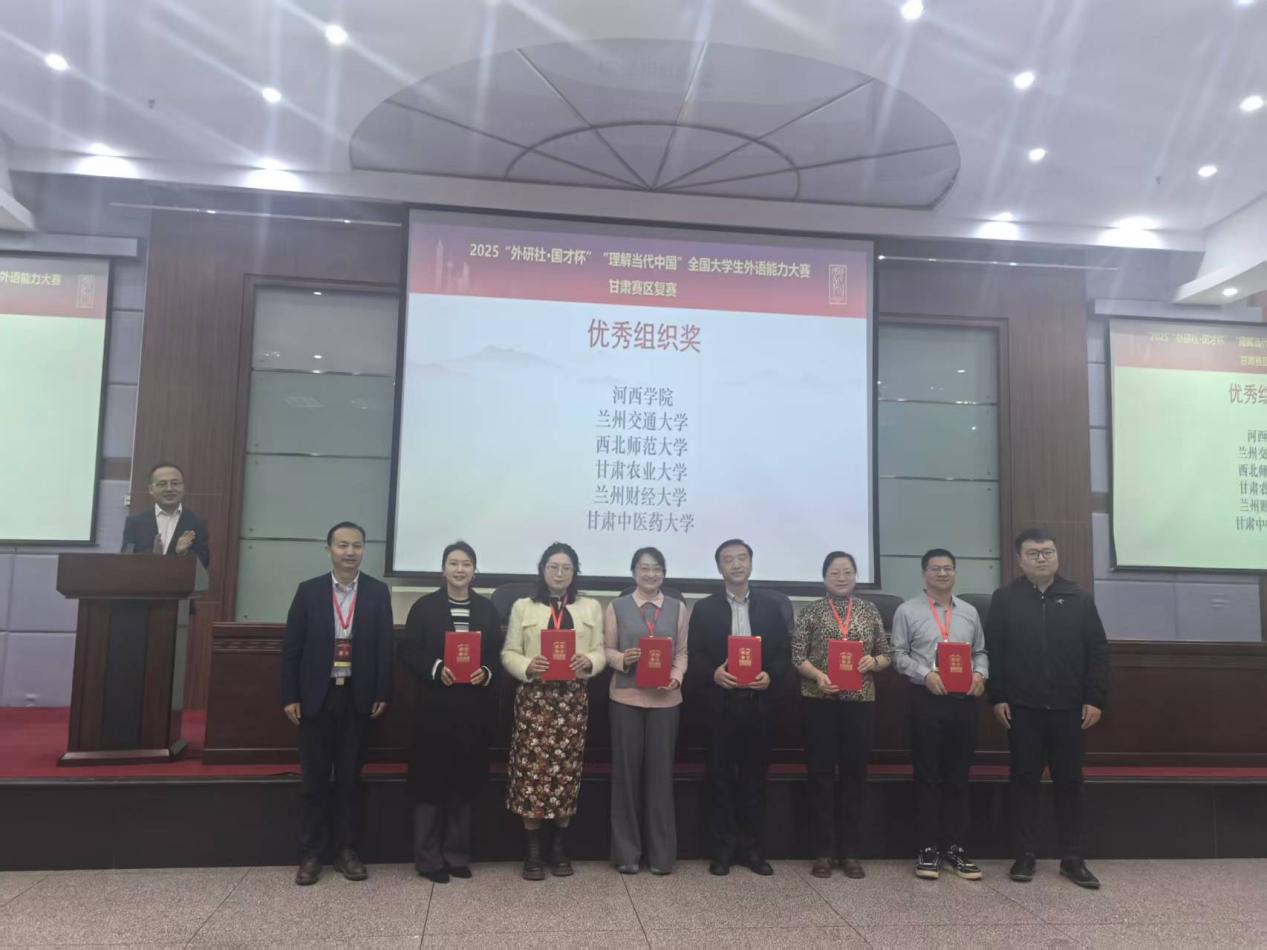 2025年11月1日,2025“外研社·国才杯”“理解当代中国”全国大学生外语能力大赛甘肃赛区复赛在河西学院成功举办。本次大赛由甘肃省教育厅主办,河西学院、甘肃省大学外语教学研究会、外语教学与研究出版社承办。大赛涵盖英语演讲、综合能力、口译、笔译及短视频五大赛项。全省二十余所学校遴选出优秀选手参加省级复赛,本次比赛我校15名同学参赛,14名同学获奖,获奖比例高达93%,学校同时获得比赛优秀组织奖。