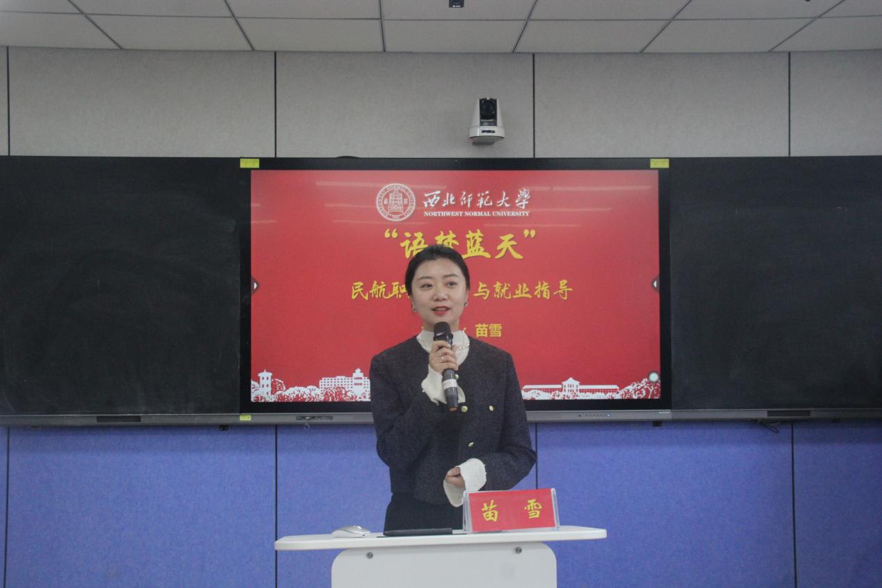 2025年11月20日,朝鲜语专业在中朝文化交流中心举办“语梦蓝天”民航职业规划与就业指导宣讲会,面向朝鲜语、阿拉伯语、英语等多个专业学生开展,助力适配社会复合型人才需求。宣讲会由广慧金通教育集团甘青区域总经理、产业教授、中国航协乘务员教员、高校毕业生就业协会航空分会副秘书长苗雪老师主讲。